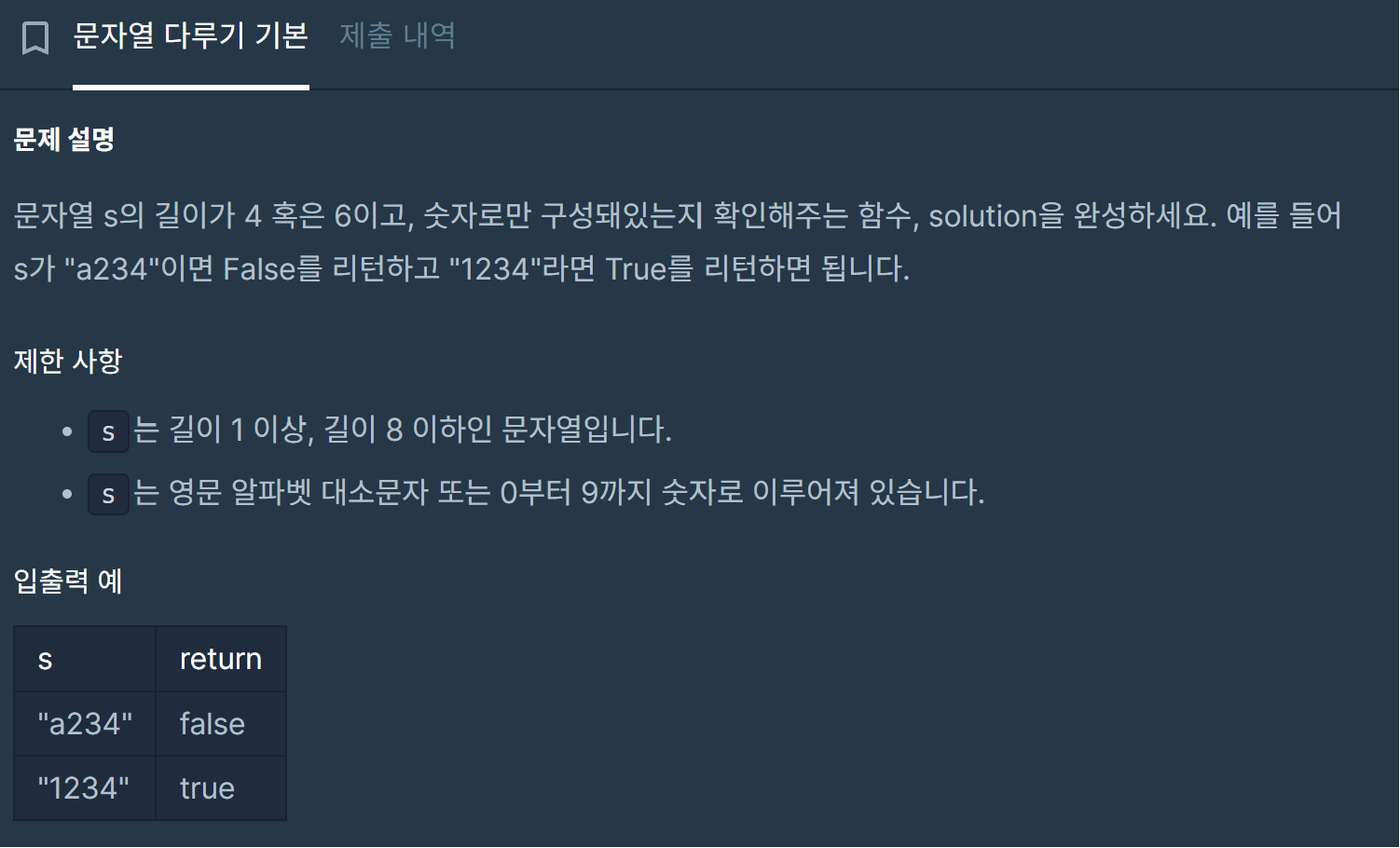 - ๋ฌธ์์ด์ ๊ธธ์ด๊ฐ 4 ๋๋ 6์ด ์๋ ๊ฒฝ์ฐ์๋ false๋ฅผ ๋ฐํํด์ผ ํ์ง๋ง, ํ์ฌ ์ฝ๋์์๋ ํด๋น false ์ฒ๋ฆฌ๊ฐ ์๋ค.