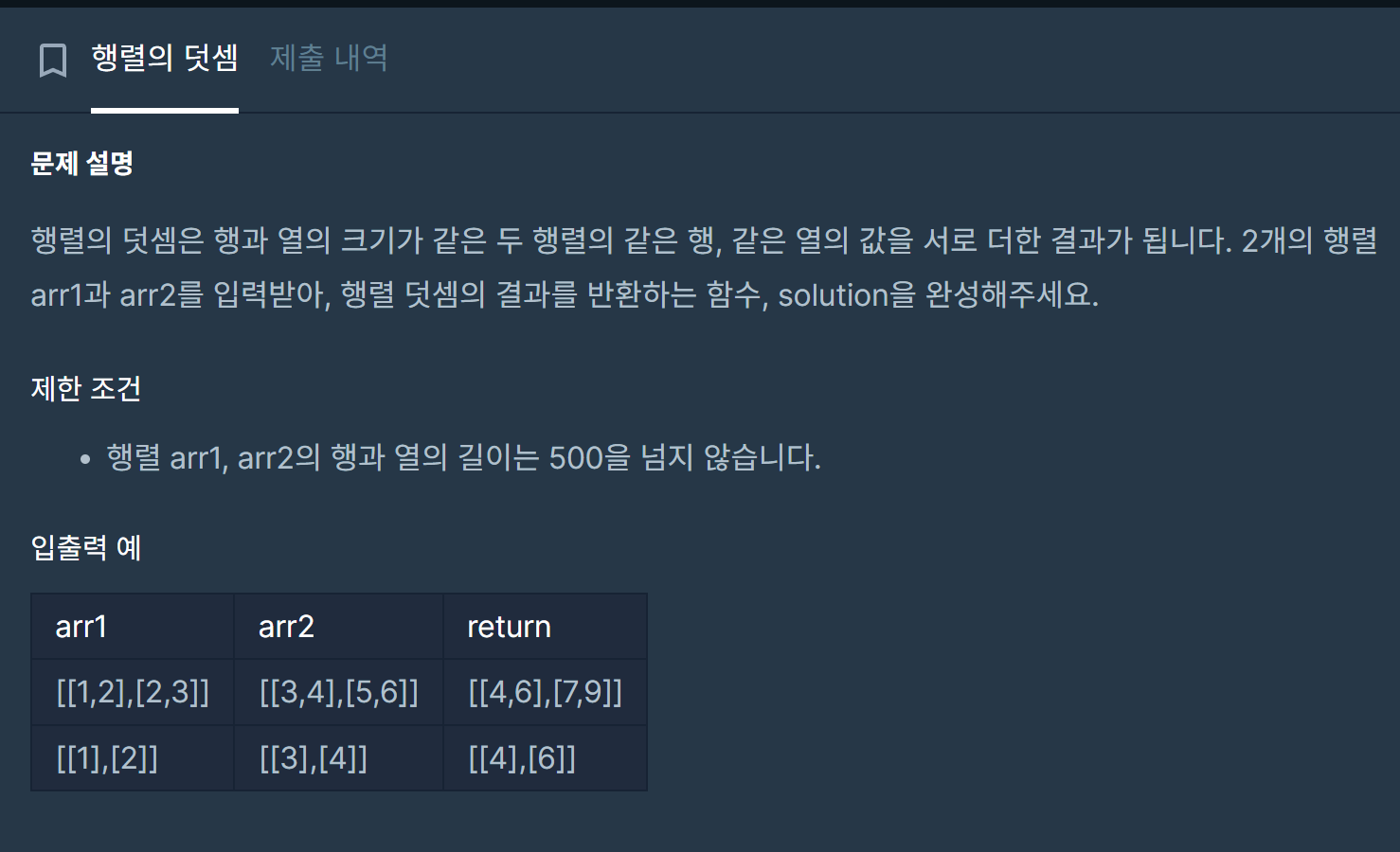 - ์์ ์ฝ๋๋ [[1,2],[2,3]] [[3,4],[5,6]] ์ ๋ ฅ ์ [[4,6],[7,9]]์ด ์๋๋ผ, [[1,2,3,4],[2,3,5,6]] ์ด ์ถ๋ ฅ๋๋ค.